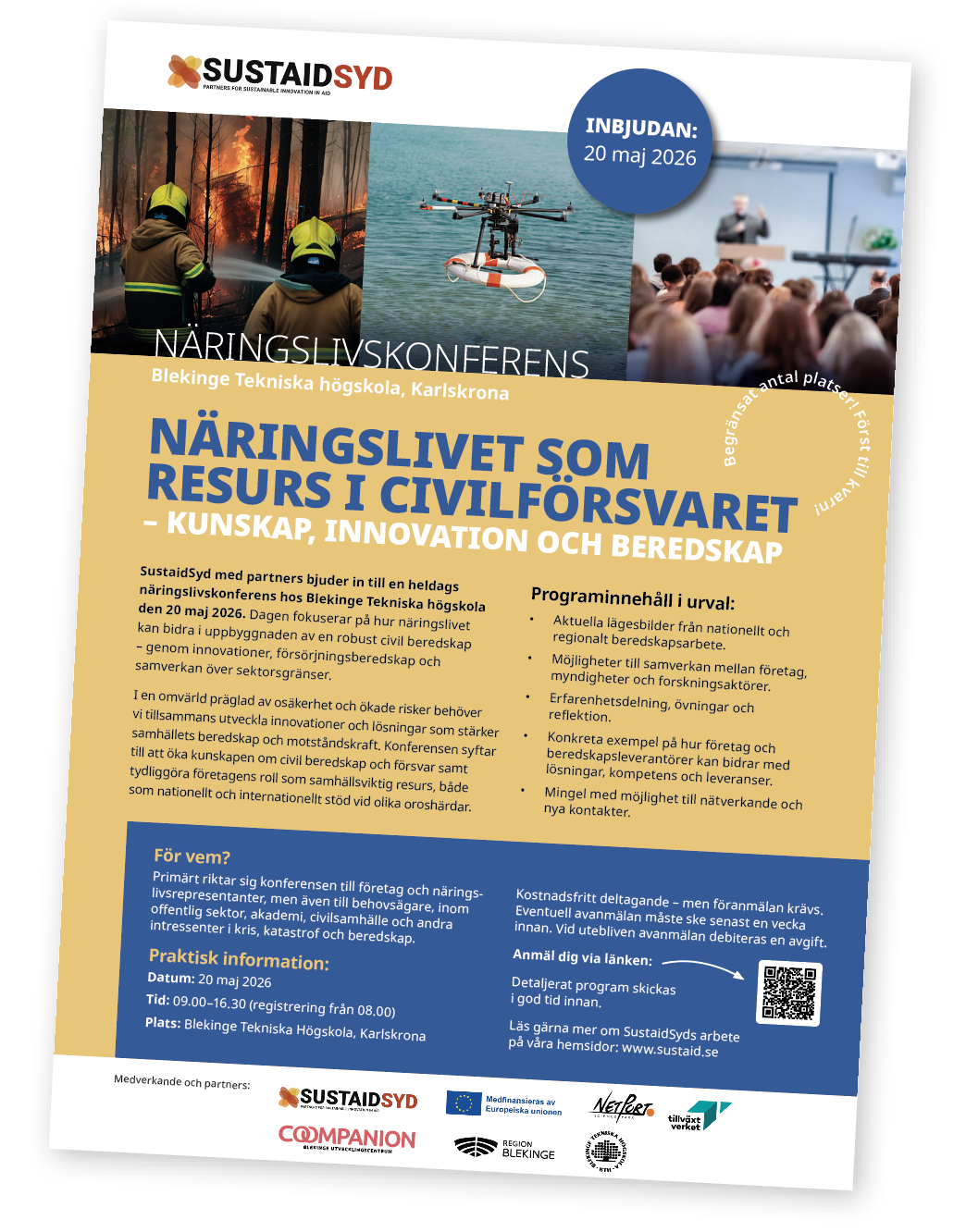 SustaidSyd med partners bjuder in till en heldags näringslivskonferens. Dagen fokuserar på hur näringslivet kan bidra i uppbyggnaden av en robust civil beredskap – genom innovationer, försörjningsberedskap och samverkan över sektorsgränser. I en omvärld präglad av osäkerhet och ökade risker behöver vi tillsammans utveckla innovationer och lösningar som stärker samhällets beredskap och motståndskraft.